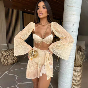 - Versatilidade: Composto por 4 peças, esse conjunto contém top com bojo, calcinha, saia e manga removível, ideal para variar o look em praia, piscina ou até em eventos à beira mar.