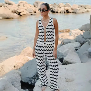 O Conjunto Listrado Feminino Calça e Blusa é a escolha perfeita para quem busca um conjunto feminino elegante que oferece conforto, praticidade e estilo atemporal. Confeccionado em crochê leve e macio, sua modelagem moderna valoriza a silhueta com caimento sofisticado, enquanto as listras em zigue-zague garantem charme extra para diferentes ocasiões.