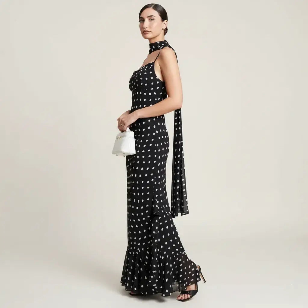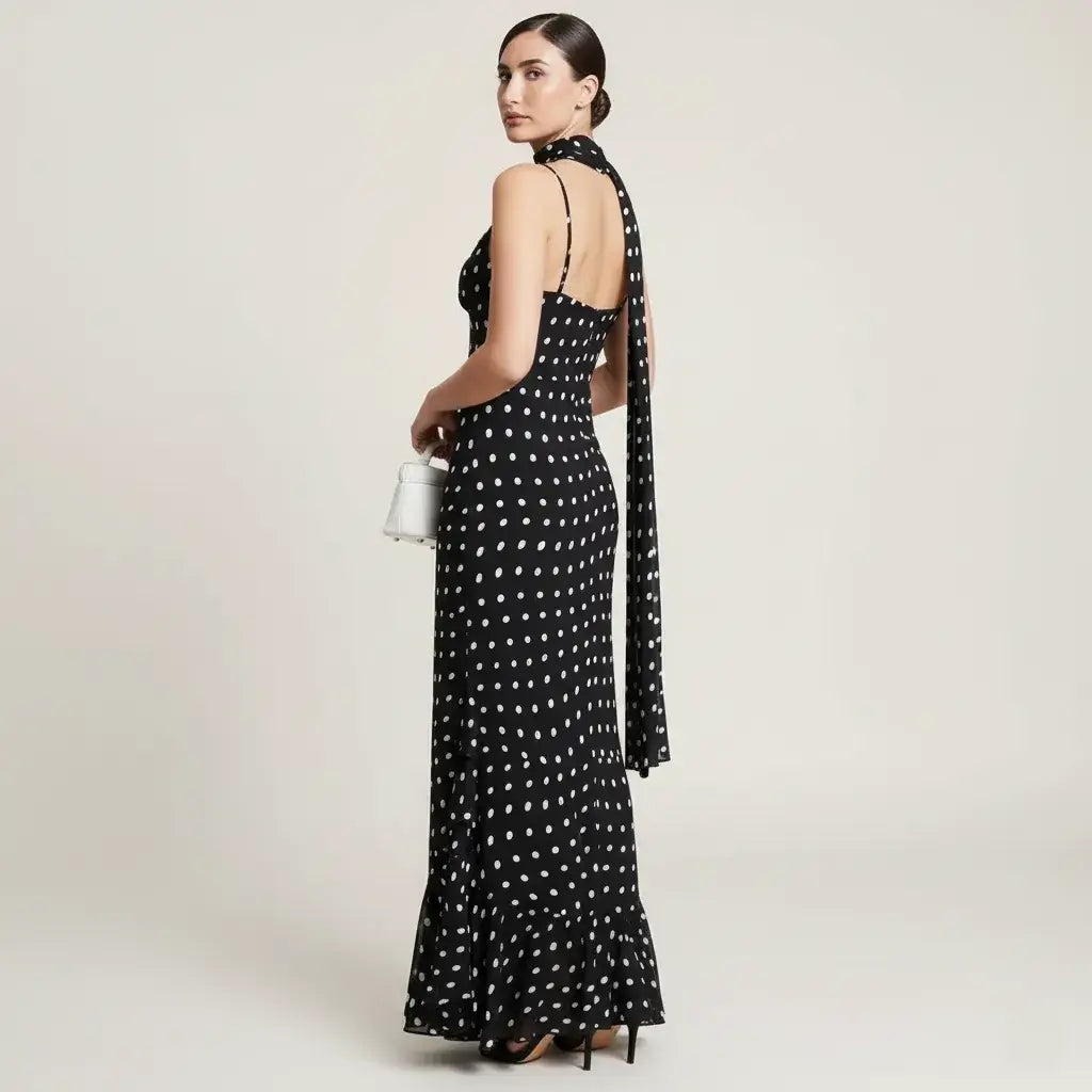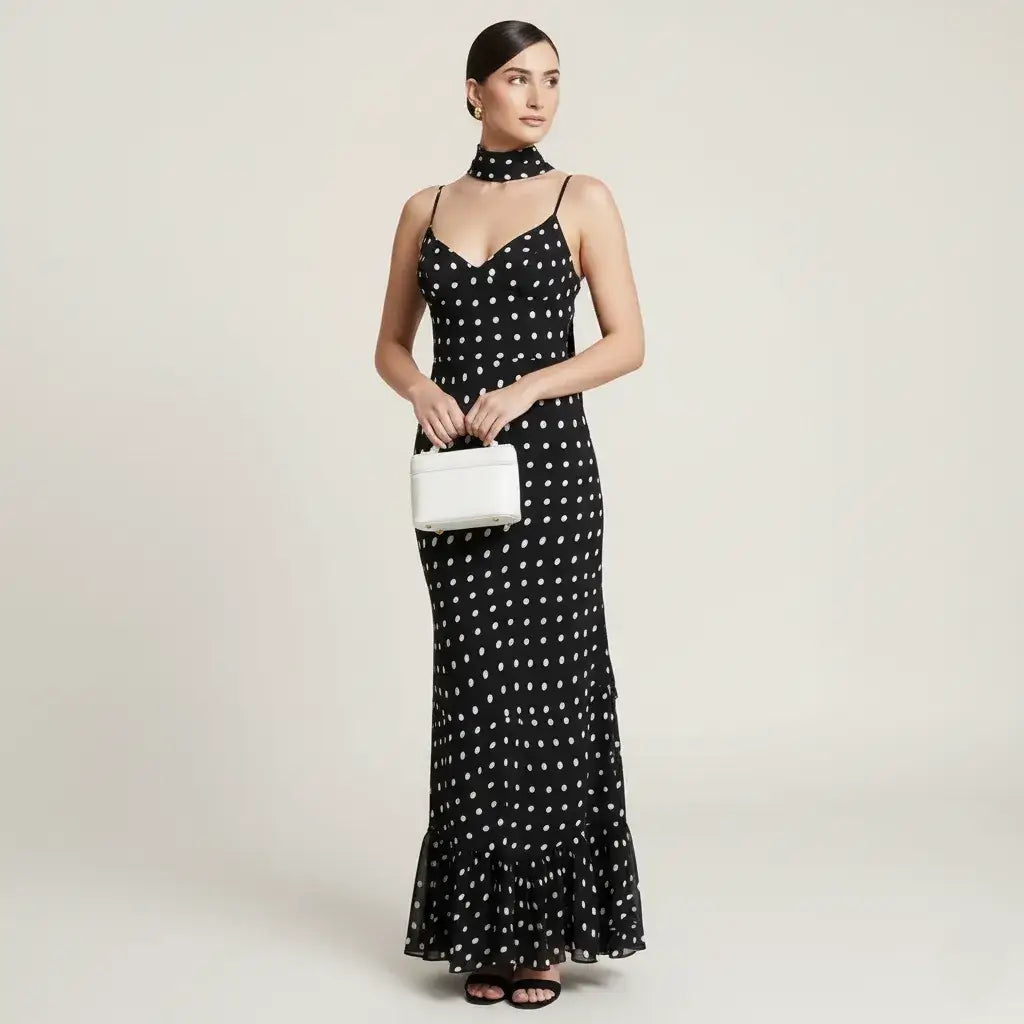 Vestido Longo Poá Feminino Elegante Preto e Branco